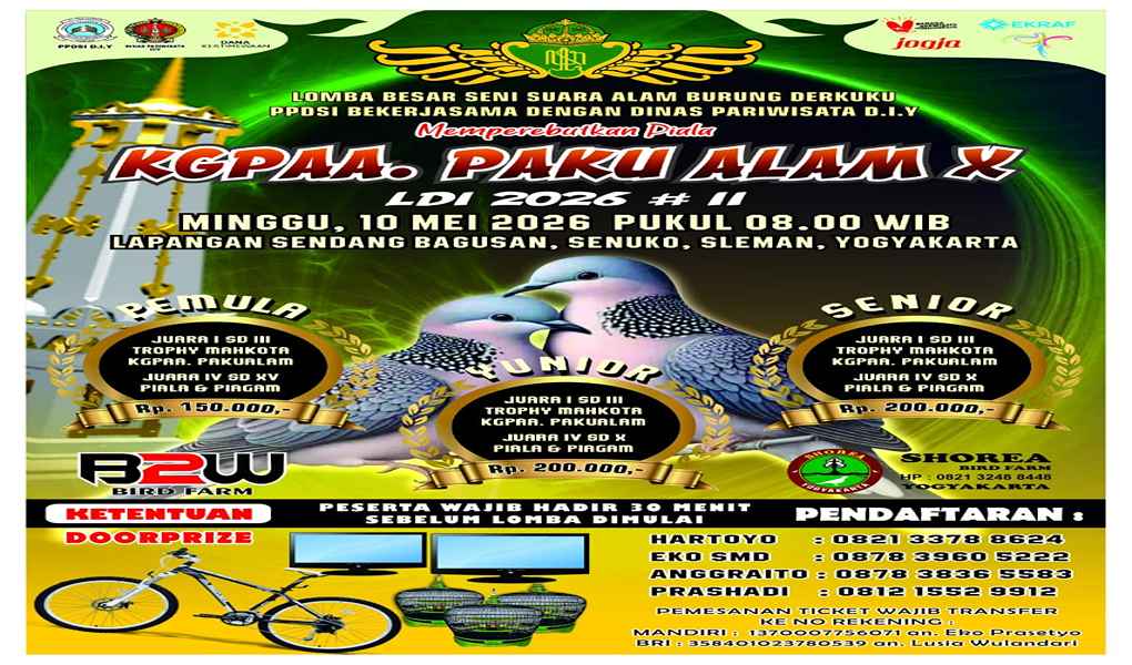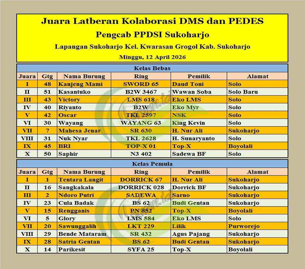 Agenda kegiatan hobi derkuku di Sukoharjo terasa semakin padat, kenyataan ini tidak menyurutkan semangat dekoe mania di Sukoharjo untuk tetap menggelar event. Kali ini Komunitas dekoe mania didukung Pengcab PPDSI Sukoharjo menggelar kegiatan Latberan Kolaborasi DMS & PEDES pada Minggu, 12 April 2026, di Lapangan Sukoharjo Kel. Kwarasan Grogol Kab. Sukoharjo.