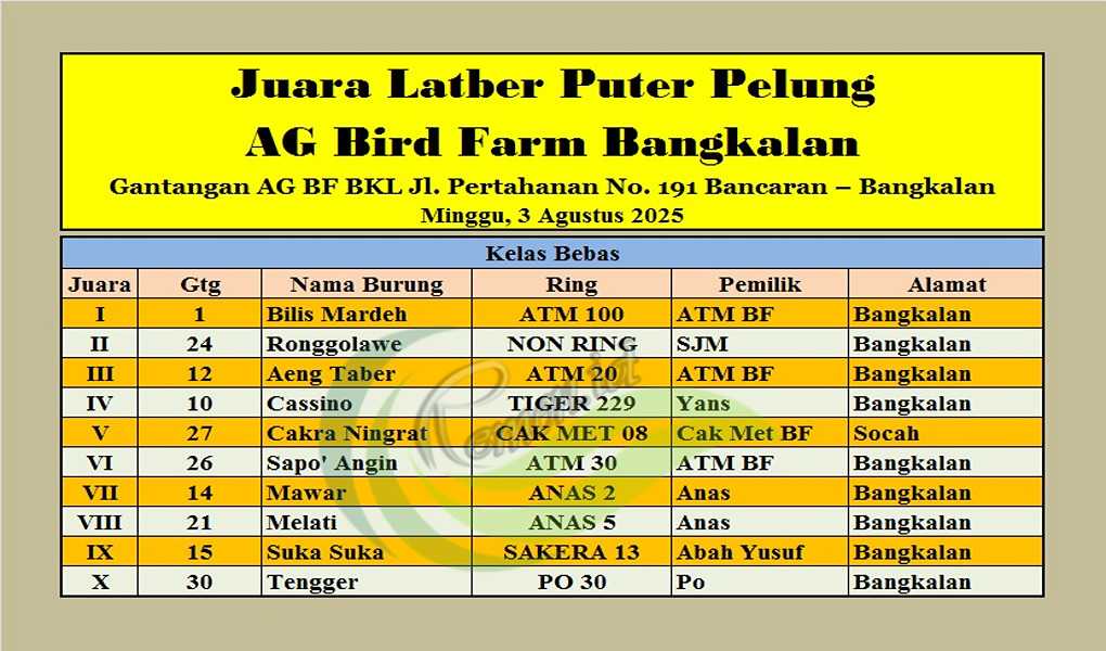 Dalam rangka memeriahkan HUT Kemerdekaan RI yang ke-80 sekaligus untuk menyemarakkan hobi puter pelung di Bangkalan, AG BF Bangkalan menggelar kegiatan lomba pada Minggu, 3 Agustus 2025. Kegiatan lomba dipusatkan di Gantangan AG BF – BKL Jl Pertahanan No. 191 Bancaran – Bangkalan, acara berlangsung sukses dan lancar tanpa gangguan.