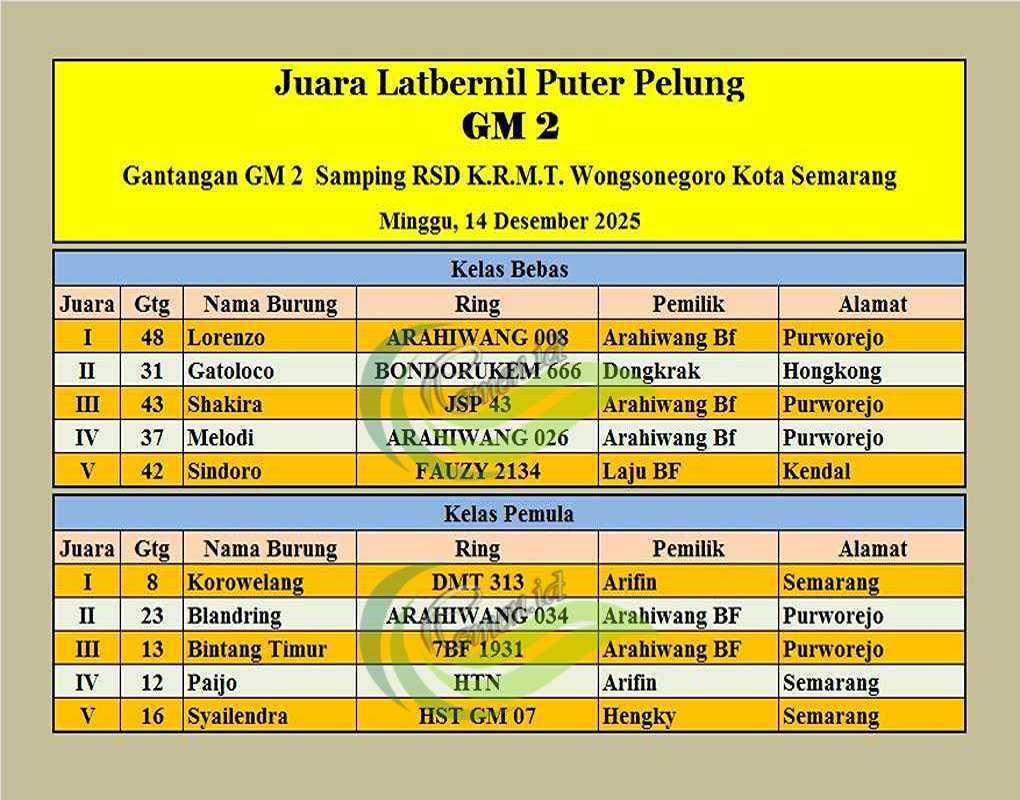 Latihan Bersama Dinilai Seni Suara Burung puter Pelung GM 2 yang dihelat pada Minggu, 14 Desember 2025 di Gantangan GM 2 samping RSD K.R.M.T. Wongsonegoro Kota Semarang berlangsung meriah. Sebanyak 56 peserta yang terbagi atas kelas Bebas dan kelas Pemula ikut ambil bagian dalam perebutan posisi kejuaraan.