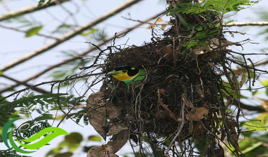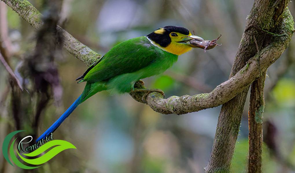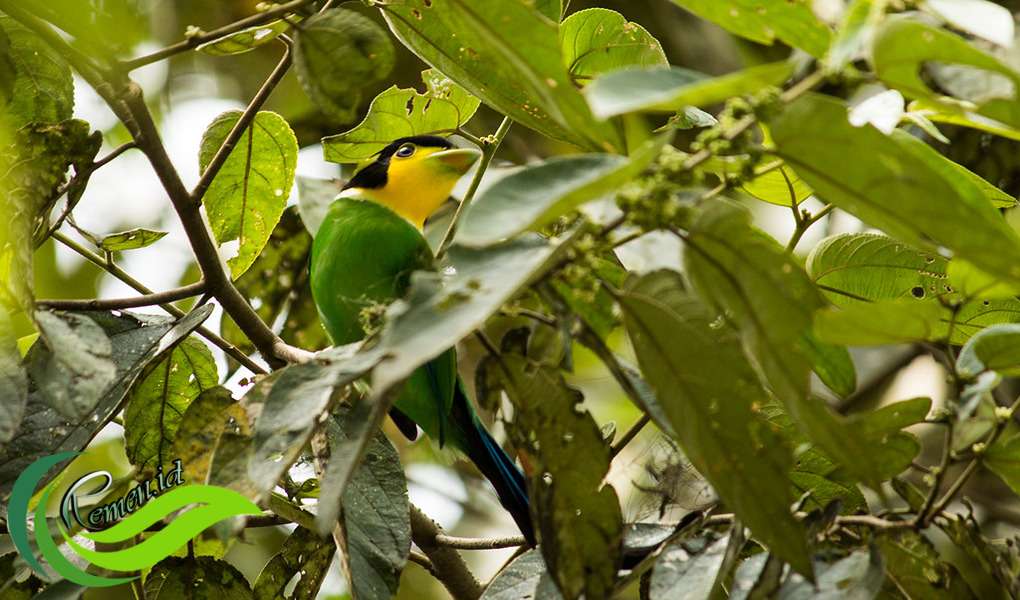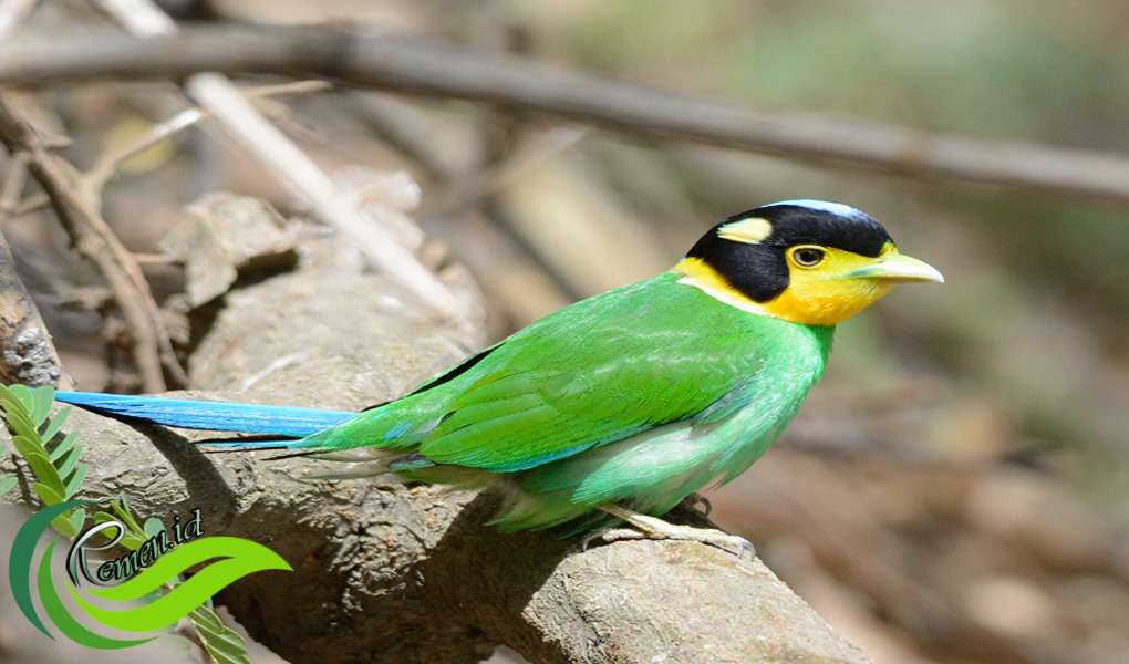 Tampak seperti burung di gambar kartun pada kaki bukit tropis dan hutan pegunungan. Benar-benar mudah dikenali, dengan tampilan warna hijau dengan kepala hitam-kuning dan ekor biru cerah. Bergerak melalui lapisan tengah dan atas hutan.