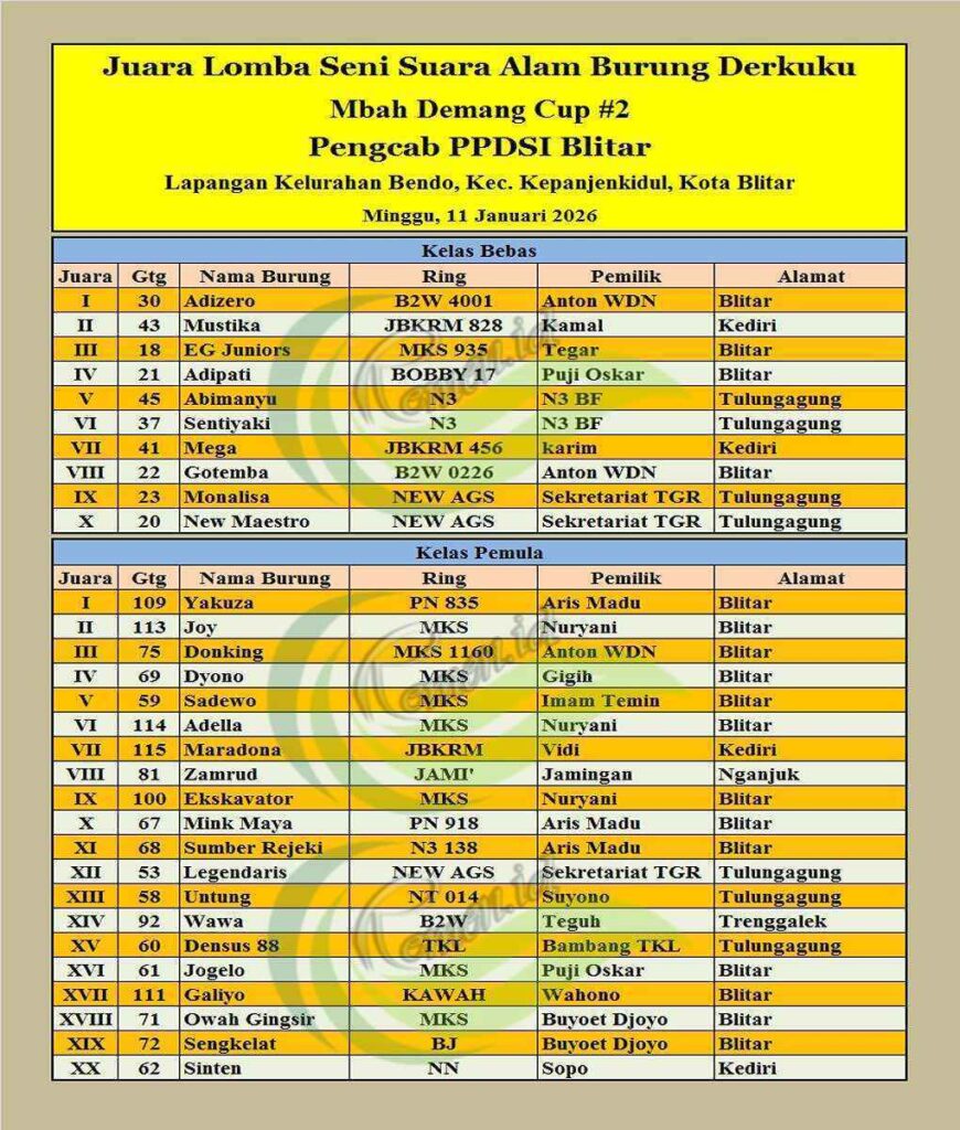 Pengcab PPDSI Blitar kembali menggelar kegiatan Lomba Seni Suara Alam Burung Derkuku. Kali ini agenda yang mereka usung bertajuk Mbah Demang Cup #2 yang dilaksanakan pada Minggu, 11 Januari 2026. Menempati lokasi di Lapangan Kelurahan Bendo, Kec. Kepanjenkidul, Kota Blitar.