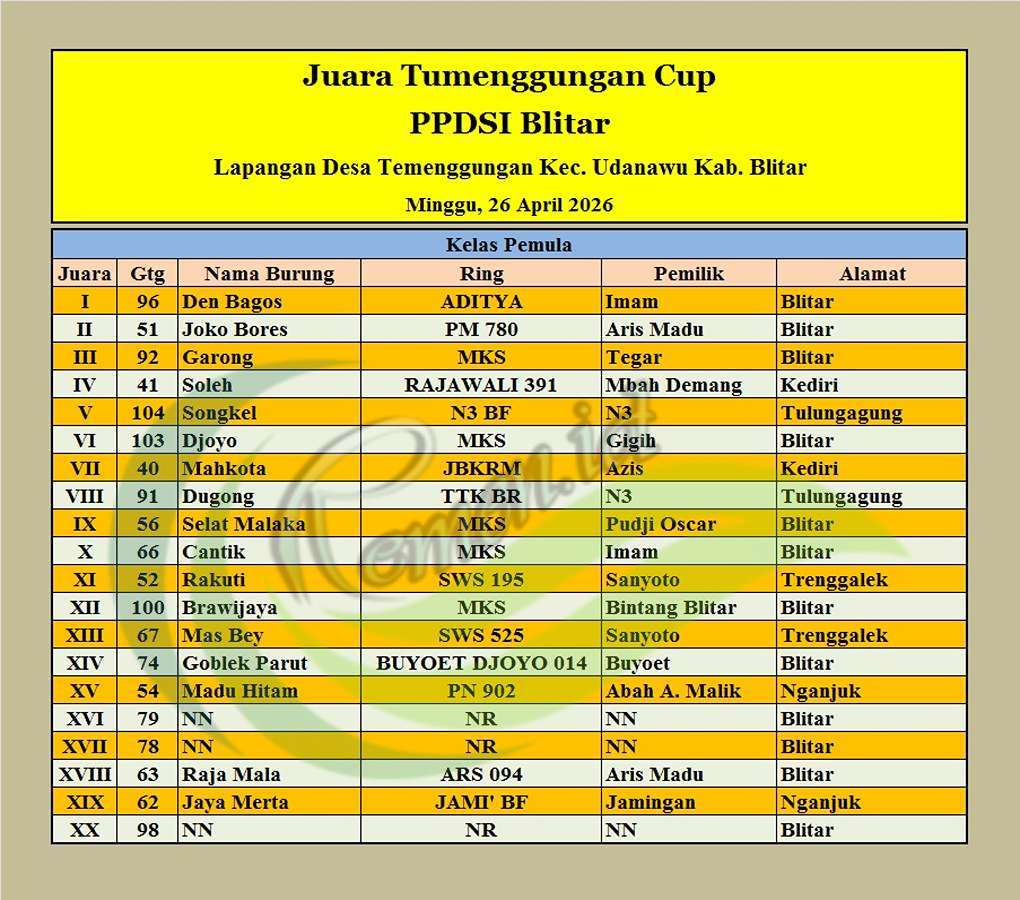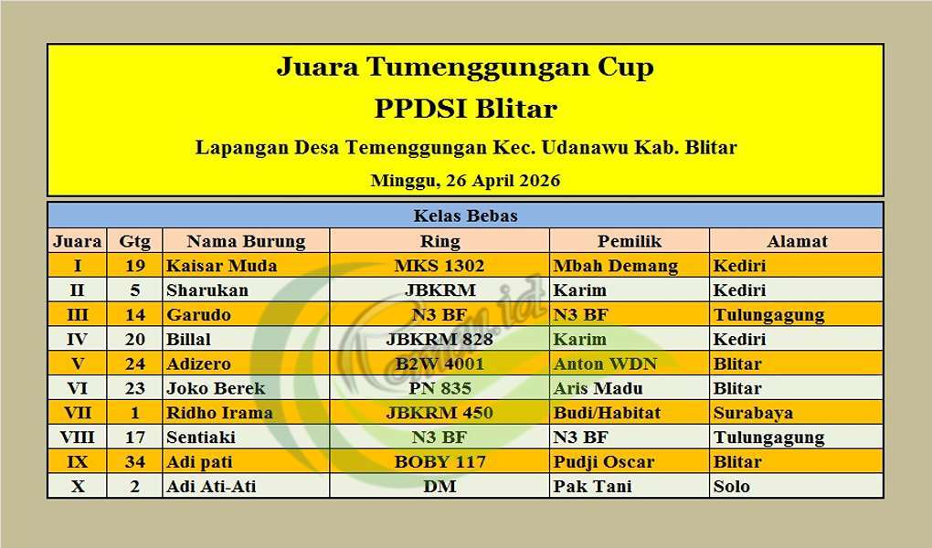 Lomba burung derkuku yang digelar oleh Pengcab PPDSI Blitar bertajuk “Temenggungan Cup”, pada hari Minggu 26 April 2026 di Lapangan Desa Temenggungan Kec Udanawu Kab Blitar, berjalan semarak. Agenda ini, betul-betul berlangsung ramai dibanjiri dekoe mania dari berbagai kota selain dari Blitar sendiri tentunya.